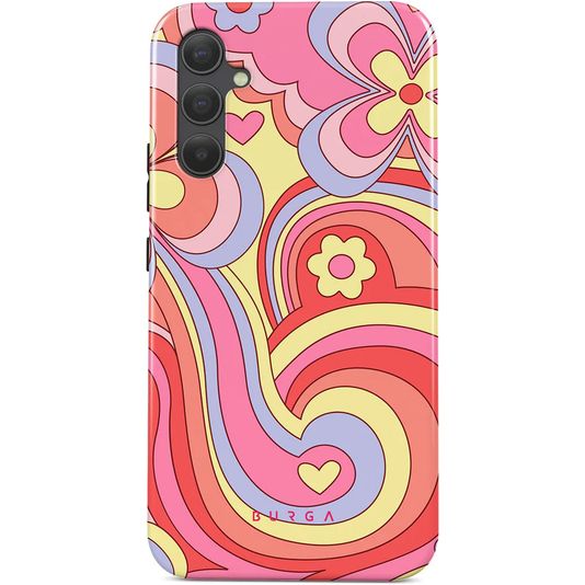 Schütze dein Samsung Galaxy A34 vor Schäden mit dem Burga Tough Backcover aus stabilem Kunststoff. Die Hülle kommt in der Farbe roller disco und deckt die Rückseite und die Seite deines Handys ab. Die Vorderseite bleibt mit diesem Backcover frei, sodass dein Bildschirm immer direkt zugänglich ist.