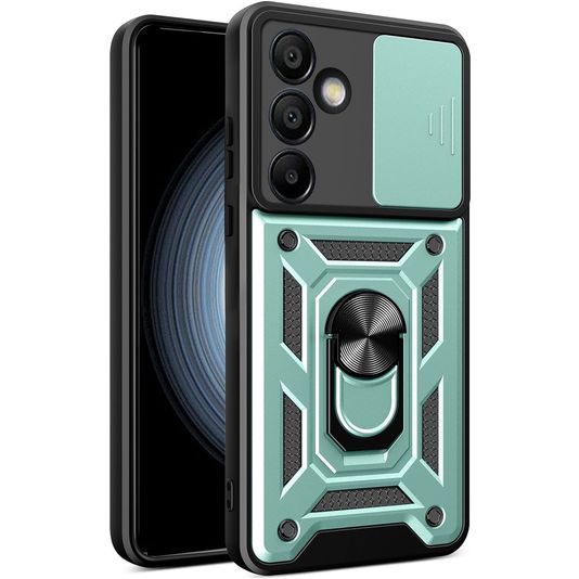 Mobigear Armor Ring Cam Slide Samsung Galaxy S24 FE Hülle Hardcase Backcover Stoßfest mit Ringhalter und Kamera Slider - Grün