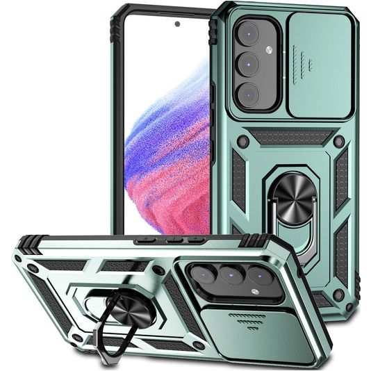Mobigear Armor Ring Cam Slide Samsung Galaxy A54 Hülle Hardcase Backcover Stoßfest mit Ringhalter und Kamera Slider - Grün