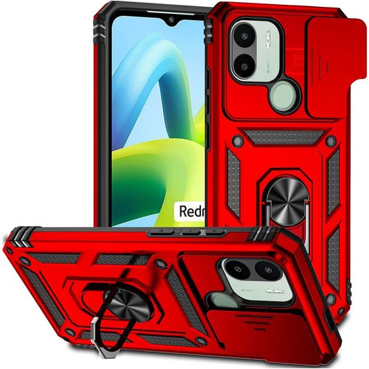 Mobigear Armor Ring Cam Slide Xiaomi Redmi A1 4G Hülle Hardcase Backcover Stoßfest mit Ringhalter und Kamera Slider - Rot
