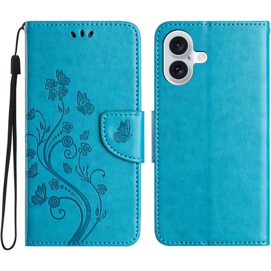 Mobigear Flowers iPhone 16 Hülle Klapphülle Geldbörse - Blau