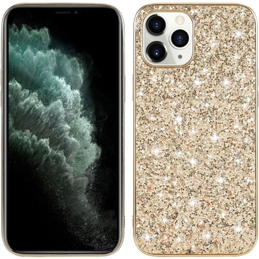 Schütze dein Apple iPhone 12 Pro vor Schäden mit dem Mobigear Glitter Backcover aus stabilem Kunststoff. Die Hülle kommt in der Farbe gold und deckt die Rückseite und die Seite deines Handys ab. Die Vorderseite bleibt mit diesem Backcover frei, sodass dein Bildschirm immer direkt zugänglich ist.