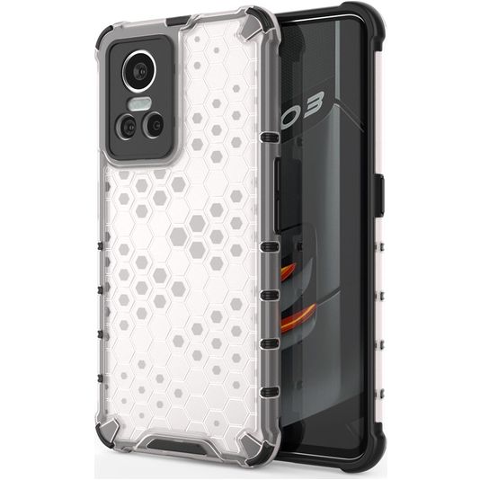 Gib deinem Telefon robusten Schutz mit dem Mobigear Honeycomb backcover. Diese Hülle schützt die Rückseite und die Seiten deines Realme GT Neo 3. Das robuste Design bietet eine solide Verteidigung gegen Schäden durch Stürze und Unfälle.