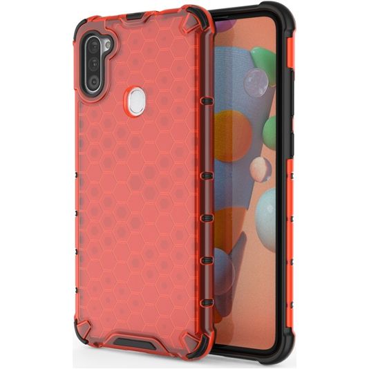 Schütze dein Samsung Galaxy A11 vor Schäden mit dem Mobigear Honeycomb Backcover aus stabilem Kunststoff. Die Hülle kommt in der Farbe rot und deckt die Rückseite und die Seite deines Handys ab. Die Vorderseite bleibt mit diesem Backcover frei, sodass dein Bildschirm immer direkt zugänglich ist.