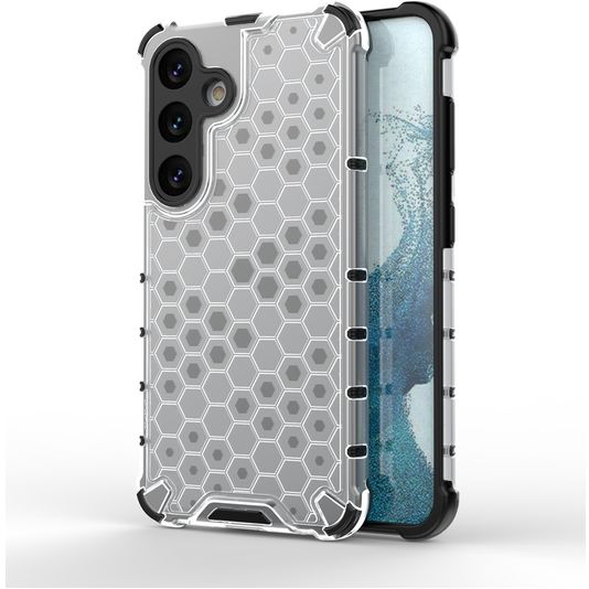 Gib deinem Telefon robusten Schutz mit dem Mobigear Honeycomb backcover. Diese Hülle schützt die Rückseite und die Seiten deines Samsung Galaxy S24. Das robuste Design bietet eine solide Verteidigung gegen Schäden durch Stürze und Unfälle.