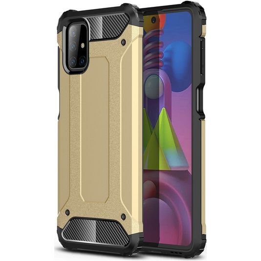 Schütze dein Samsung Galaxy M51 vor Schäden mit dem Mobigear Outdoor Backcover aus stabilem Kunststoff. Die Hülle kommt in der Farbe gold und deckt die Rückseite und die Seite deines Handys ab. Die Vorderseite bleibt mit diesem Backcover frei, sodass dein Bildschirm immer direkt zugänglich ist.