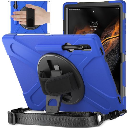 Mobigear SureGrip XGuard Samsung Galaxy Tab S8 Ultra Hülle Kunststoff,Silikon Backcover + Stifthalter + Schulterträger + Ständer - Blau
