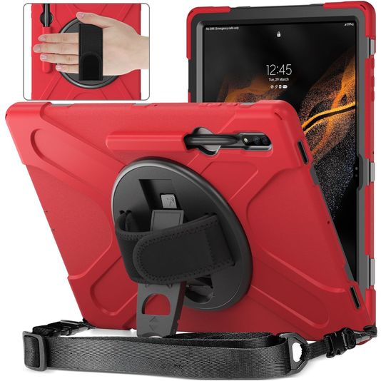 Mobigear SureGrip XGuard Samsung Galaxy Tab S8 Ultra Hülle Kunststoff,Silikon Backcover + Stifthalter + Schulterträger + Ständer - Rot