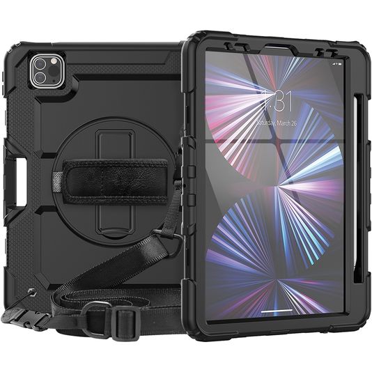 Mobigear SureGrip Xtreme iPad Pro 11 Zoll (2025) Hülle Kunststoff,Silikon Backcover + Stifthalter + Schulterträger + Ständer - Schwarz