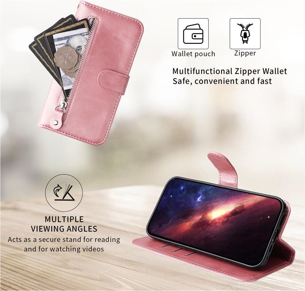Willst du eine Apple iPhone 17 Hülle mit Rundum-Schutz und einem stylischen und praktischen Design? Dann ist diese Mobigear Zipper Klapphülle für Apple iPhone 17 die perfekte Wahl. Die Klapphülle ist aus hochwertigem Kunstleder gefertigt und kommt in der Farbe roségold. Mit einer Klapphülle ist dein Apple iPhone 17 rundum gut geschützt, auch der empfindliche Bildschirm. Die Klappe öffnet sich seitlich wie ein Buch und schließt sich fest mit einem Magnetverschluss. Es gibt Platz für 3 Karten, damit du deine Bankkarte oder deinen Ausweis immer zur Hand hast.