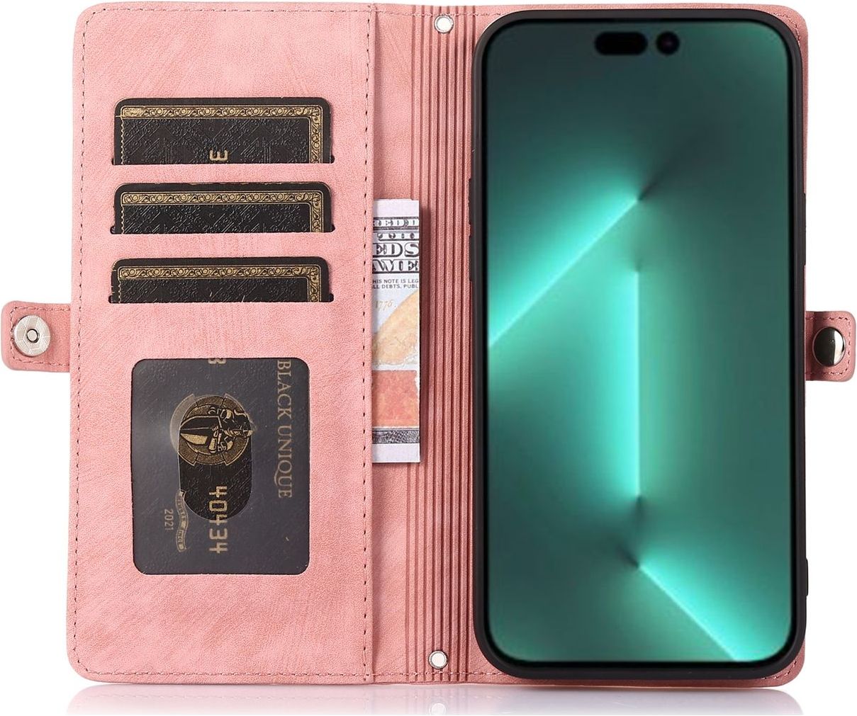 Mit dieser praktischen Hülle kannst du nicht nur dein Handy schützen. Dank ihres cleveren Designs kannst du jetzt auch ohne lose Brieftasche ausgehen. Es gibt ein spezielles Fach für Münzen und ein Fach, in dem du Geldscheine aufbewahren kannst.