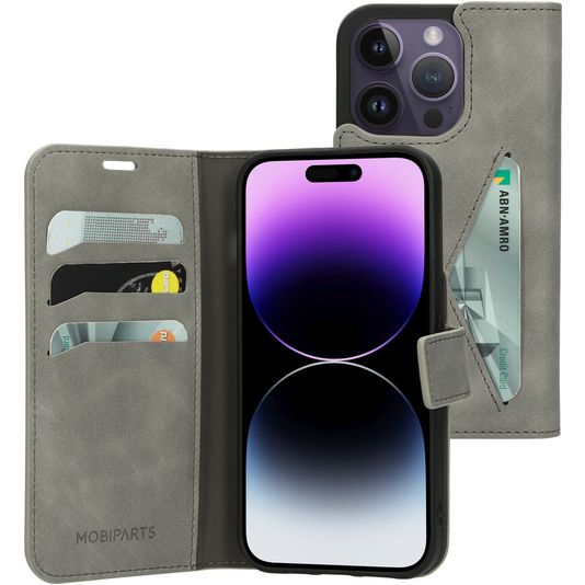 Willst du eine Apple iPhone 14 Pro Hülle mit Rundum-Schutz und einem stylischen und praktischen Design? Dann ist diese Mobiparts Classic Wallet Klapphülle für Apple iPhone 14 Pro die perfekte Wahl. Die Klapphülle ist aus hochwertigem Kunstleder gefertigt und kommt in der Farbe granite grey. Mit einer Klapphülle ist dein Apple iPhone 14 Pro rundum gut geschützt, auch der empfindliche Bildschirm. Die Klappe öffnet sich seitlich wie ein Buch und schließt sich fest mit einem Magnetverschluss. Es gibt Platz für 4 Karten, damit du deine Bankkarte oder deinen Ausweis immer zur Hand hast.