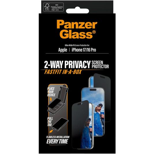 PanzerGlass FastFit iPhone 16 Pro Gehärtetes Glas Displayschutz Privacy - Hüllenfreundlich - Schwarz